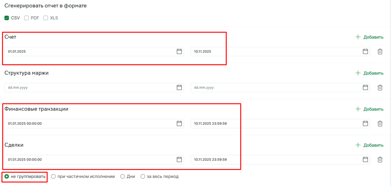 4. В полях «Счет», «Финансовые транзакции» и «Сделки» укажите: